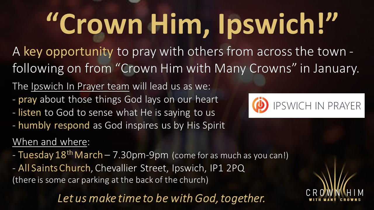 Another wonderful opportunity following “Crown Him with Many Crowns” in January to pray for the town of Ipswich as people from a range of Christian communities come together. Please use this poster to publicise this key event!