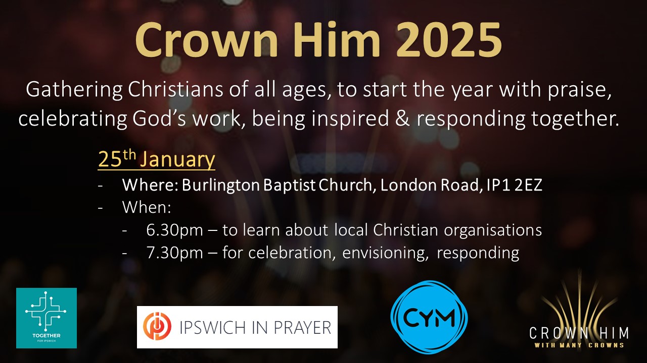 Crown Him in January 2025 ! A wonderful opportunity to gather the Christian community in celebration of what God has done in 2024 and seek Him for His plans for 2025. The event will appropriately be at the end of Christian Unity week.